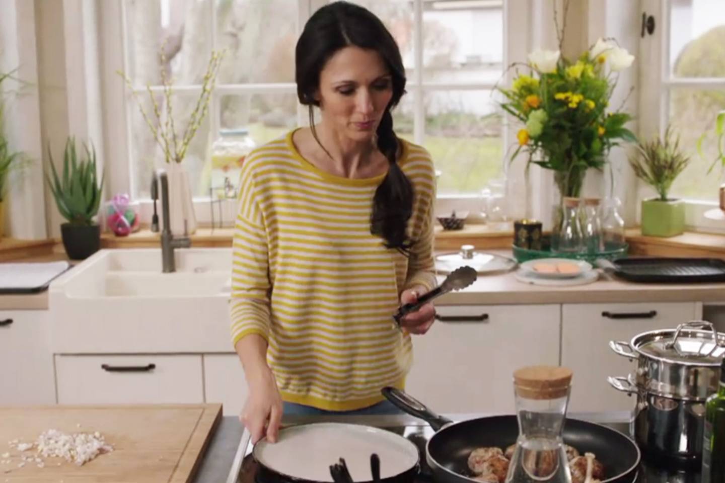 Vandaag bereidt Sandra Bekkari smeuïge kippengehaktballetjes in tomatensaus met gegrilde aubergines en pommes duchesse. Als zoete afsluiter serveert ze een toast van zoete aardappel met pindakaas en banaan.