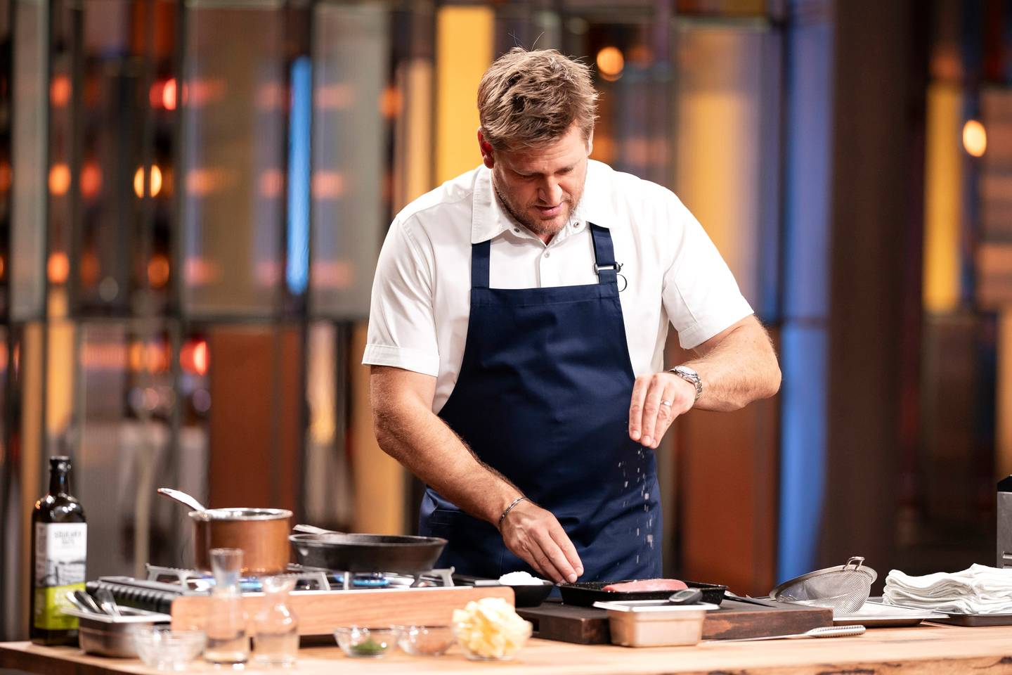 Vier chefs nemen het tegen elkaar op in de immuniteitsopdracht. Ze krijgen een uur de tijd om het gerecht van Curtis Stone na te maken: varkenshaas met citrus beurre monté, gestoofde venkel, pistache-dukkah en wortelpuree. En dat zonder recept.