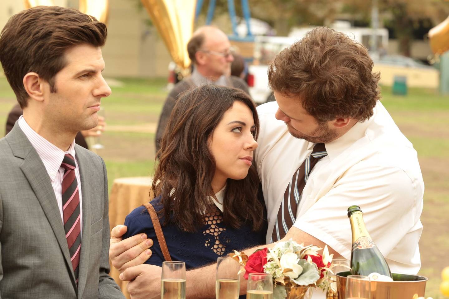 Amy Poehler (Leslie Knope), Nick Offerman (Ron Swanson), Aubrey Plaza (April Ludgate), Chris Pratt (Andy Dwyer), Aziz Ansari (Tom Haverford), Adam Scott (Ben Wyatt)