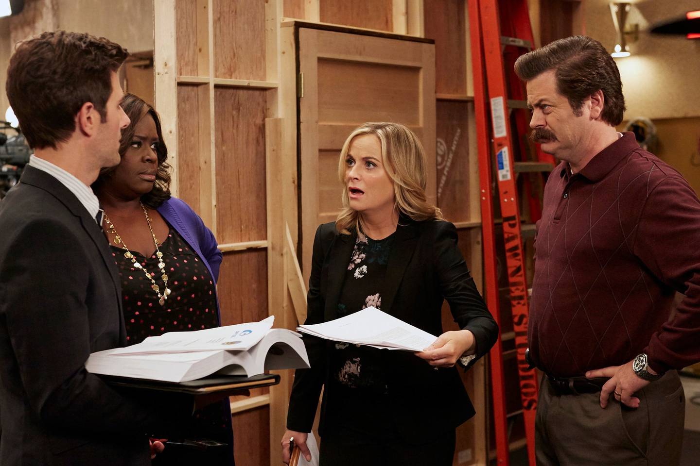 Amy Poehler (Leslie Knope), Nick Offerman (Ron Swanson), Aubrey Plaza (April Ludgate), Chris Pratt (Andy Dwyer), Aziz Ansari (Tom Haverford), Adam Scott (Ben Wyatt)